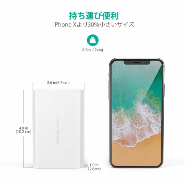 コンパクトで大容量:iPhone Xより30%小さいサイズ。でも10000mAhの大容量でiPhone 8を約3.2回、Galaxy S8を約2回、iPad mini 4も約1.2回充電できます。